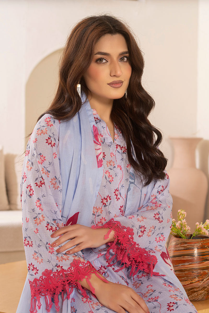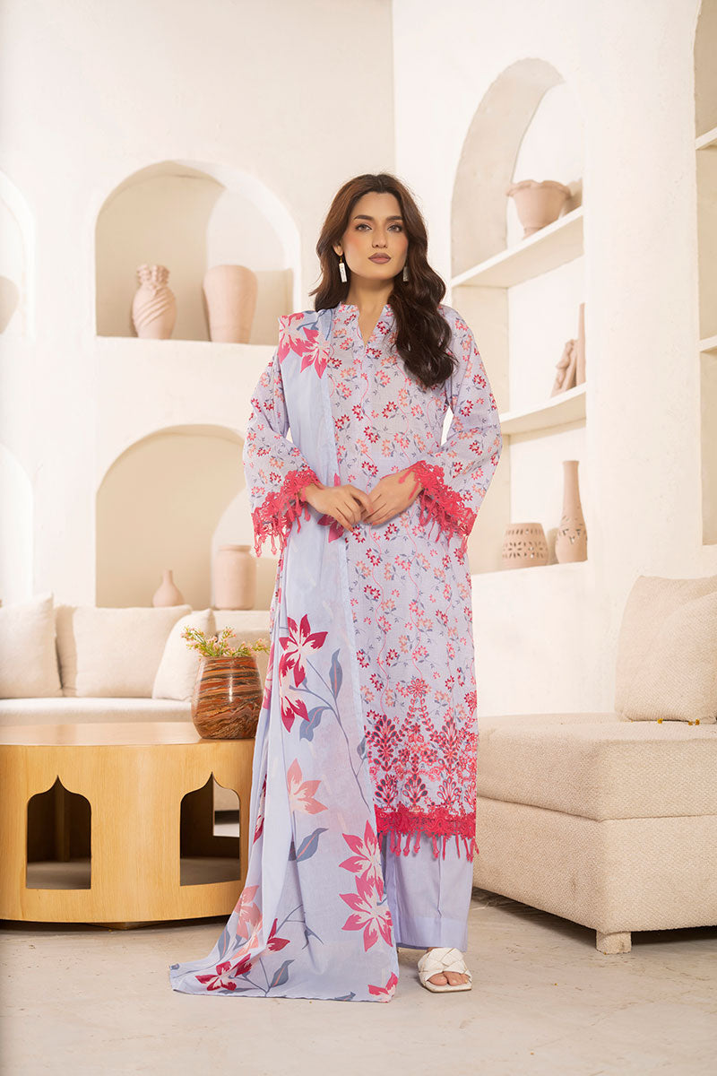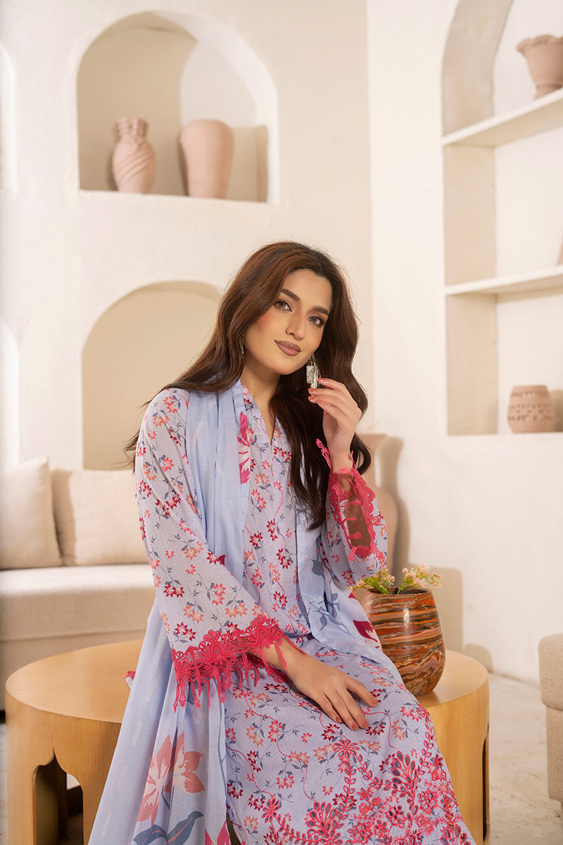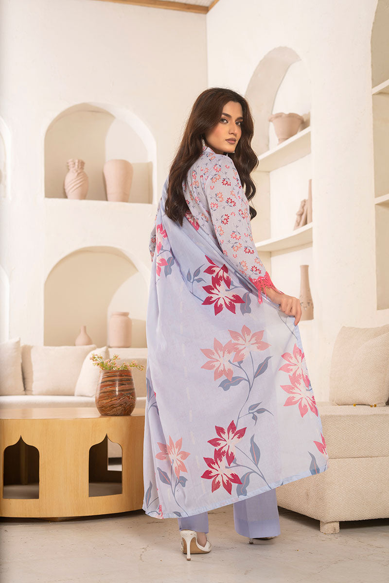 Embroidered and Printed Lawn FrontPrinted Lawn Back and SleevesPrinted Voil Lawn DupattaDyed Cotton Trouser
